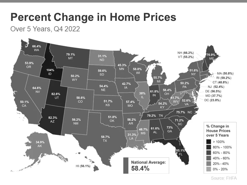 While that’s the national number, if you want to know what happened in your area, look at the map below from the Federal Housing Finance Agency (FHFA). It shows on average how much home prices have risen over the past five years, which has been a major driver behind equity growth.