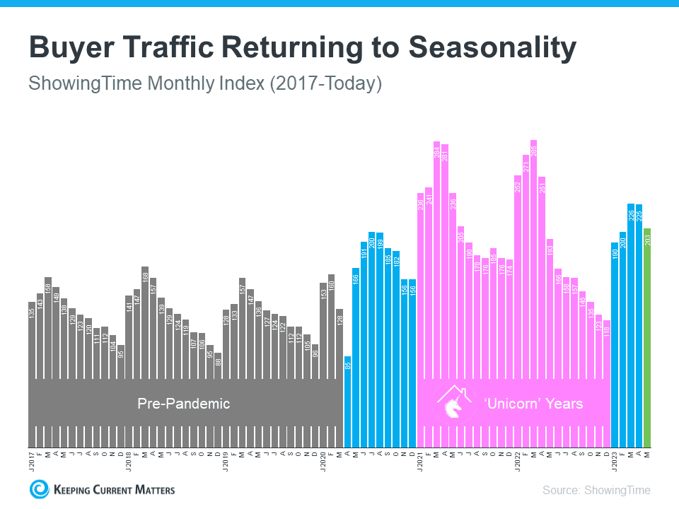 It shows there’s seasonality in real estate. If you look at the last normal years in the market (shown in gray), there was a consistent pattern as buyer activity peaked in the first half of each year (during the peak homebuying season in the spring) and slowed as each year came to a close.