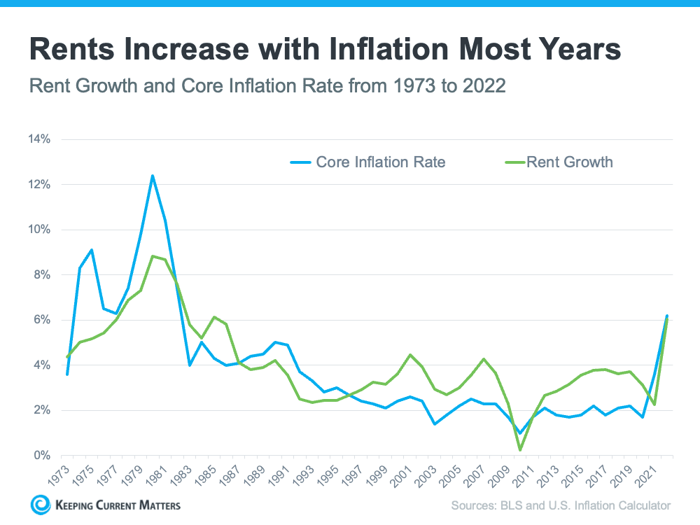 The alternative to homeownership is renting – and rents tend to move alongside inflation. That means as inflation goes up, your monthly rent payments tend to go up, too (see graph below):