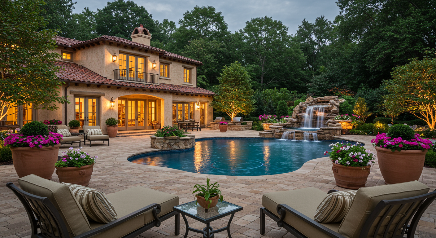 The warm, earthy tones in this Tuscan backyard bring coziness to the open space. A soothing pool waterfall and comfortable seating make this an ideal spot to relax.