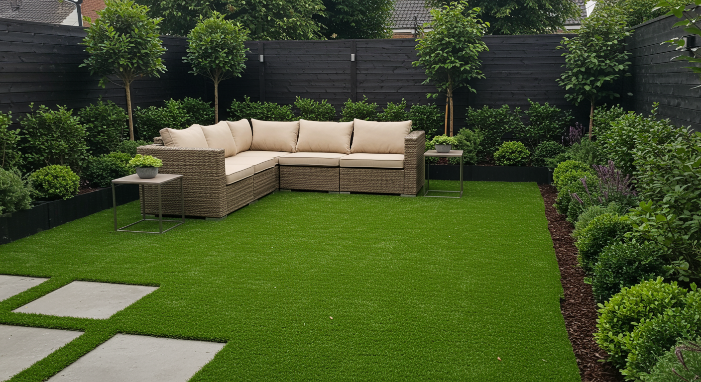 For a low-maintenance yard, Groundworks Inc. used artificial turf instead of grass. The sofa provides plenty of room for lounging and enjoying the surrounding greenery.