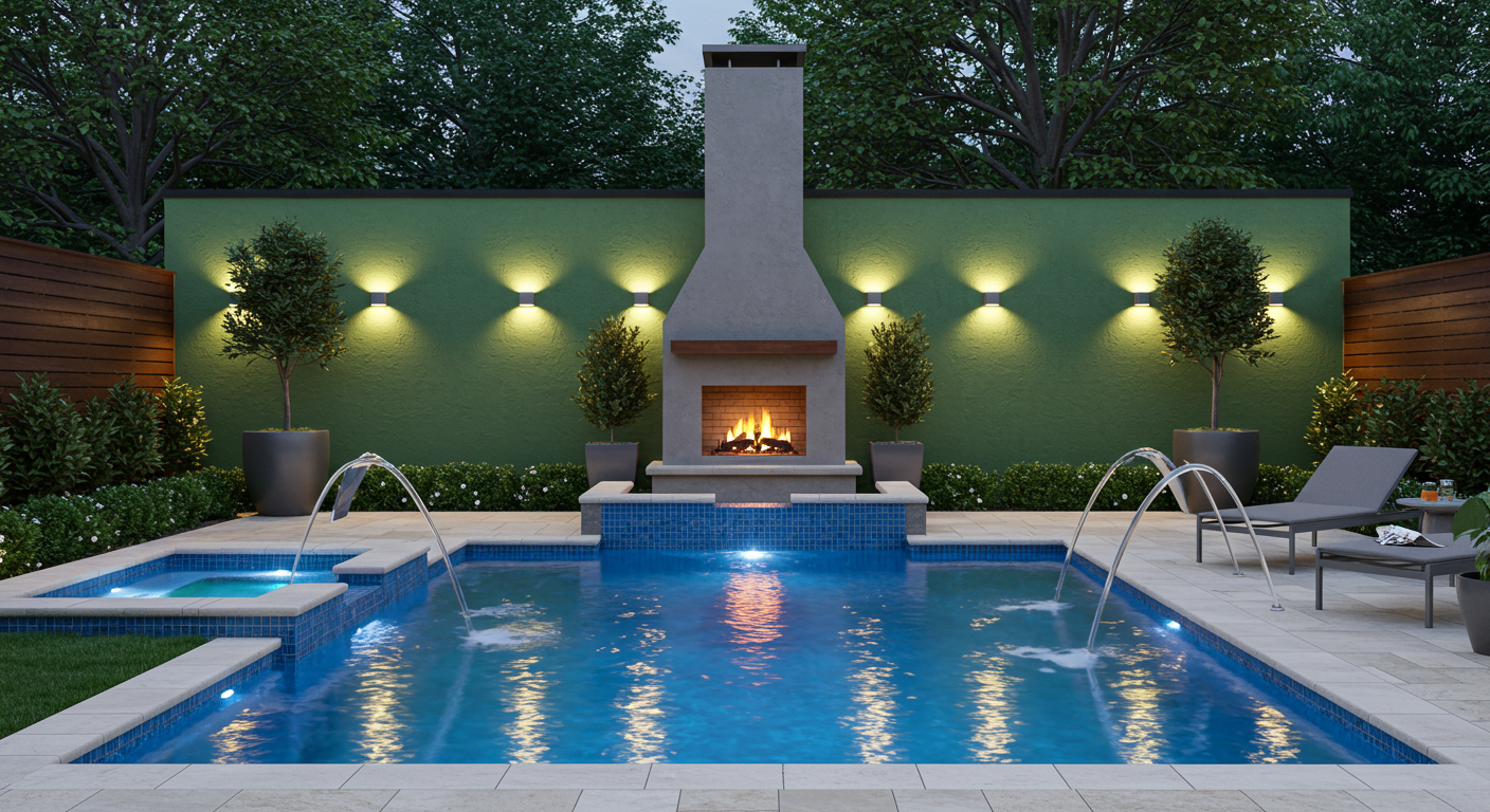 Limestone coping surrounds the pool area of this modern backyard to create a stunning effect. Soft lighting around the pool creates a calm atmosphere, while the vibrant green stucco wall brings energy to the space. The fireplace creates a stark contrast against the deep blue water spouts and pool.