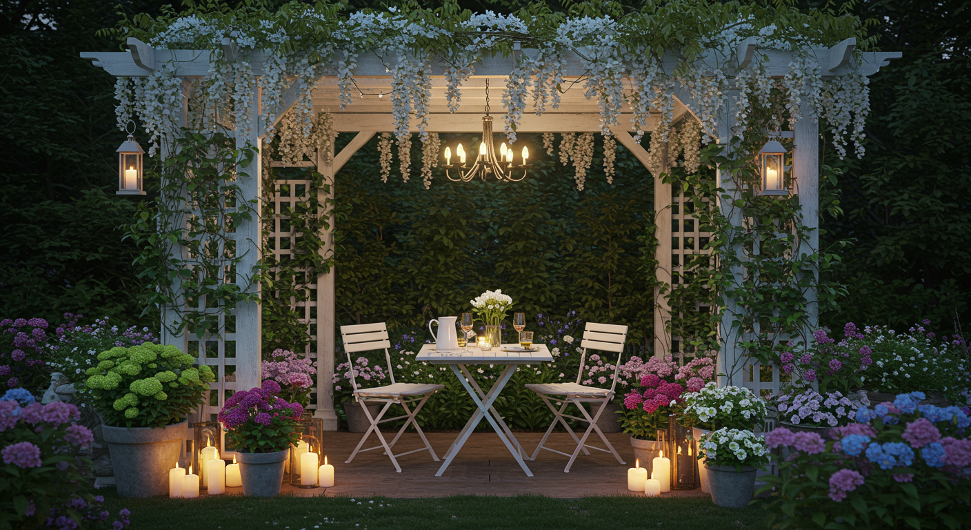 A small dining table under a white pergola creates a romantic outdoor dining experience. The candle chandelier, coupled with the hanging white wisteria, provides a calming ambiance. Several container plants enhance the serene look.