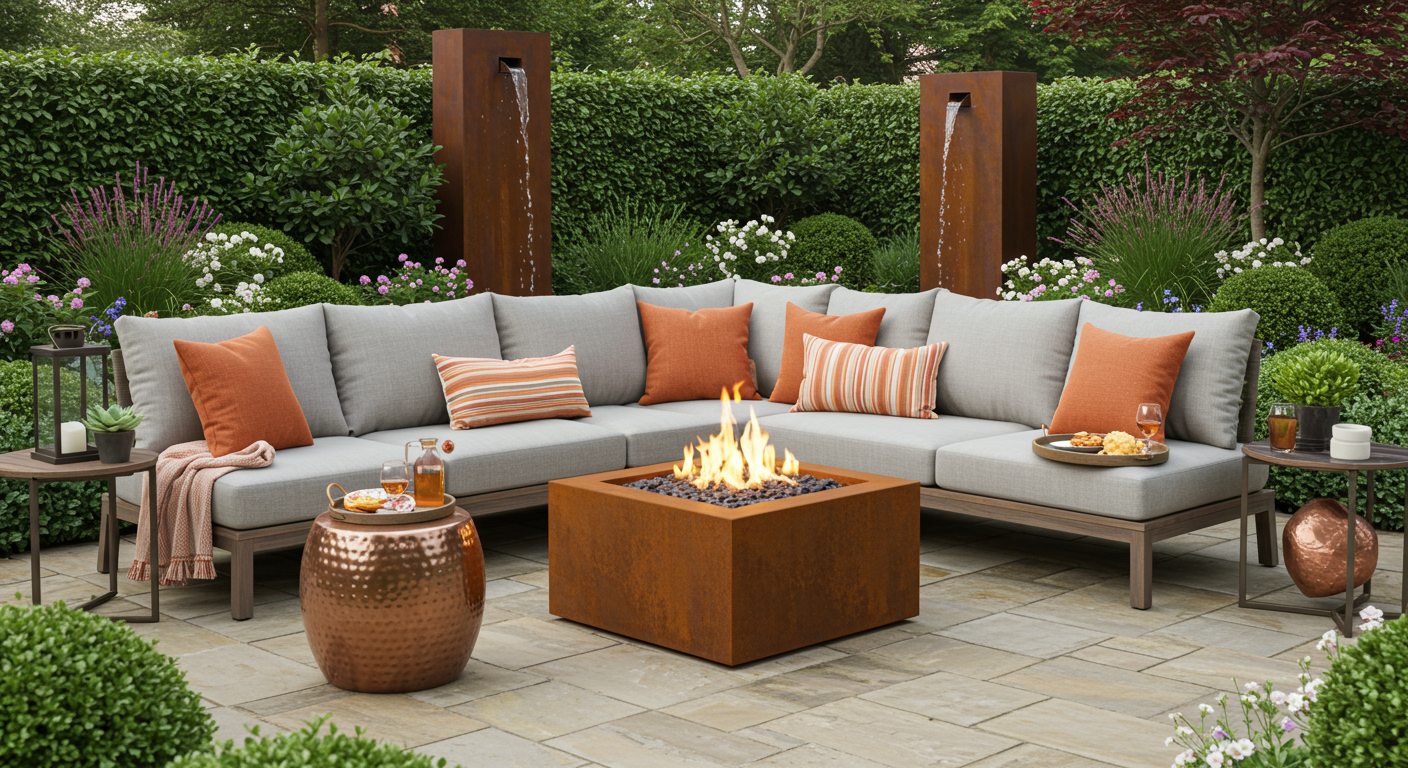 The contemporary seating around the copper fire pit allows for a cozy large gathering. The fire pit brings warmth, while a copper water feature adds dimension to the space. Vibrant pillows are the only touches of color in the outdoor space.
